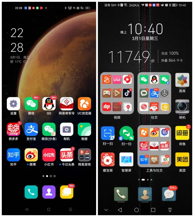 手机首页是用户解锁手机以后的第一界面,按照用户心理以及使用习惯在首页出现的app是用户使用最频繁的app。而在首页可容纳更多的APP无疑是对于用户来说是最简便的操作。而下图就是ColorOS与HarmonyOS在首页app的最直接对比。这里都是采用一个时钟插件其余界面均分布app图标。双方的桌面APP布局均是5*6(左侧为ColorOS,右侧为HarmonyOS)。