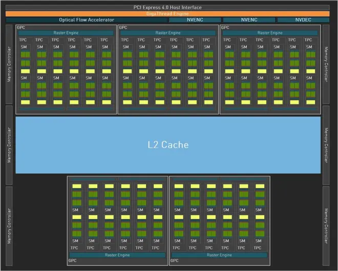 同时还有240个第四代Tensor张量核心、60个RT光追核心、240个纹理单元,同样也比上代多了整整25%,二级缓存扩大到足足48MB,但是ROP光栅单元反而从96个减少到了80个。