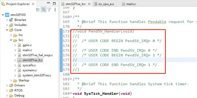 注释掉默认的PendSV_Handler、SVC_Handler,并在SysTick_Handler中启动RTOS心跳