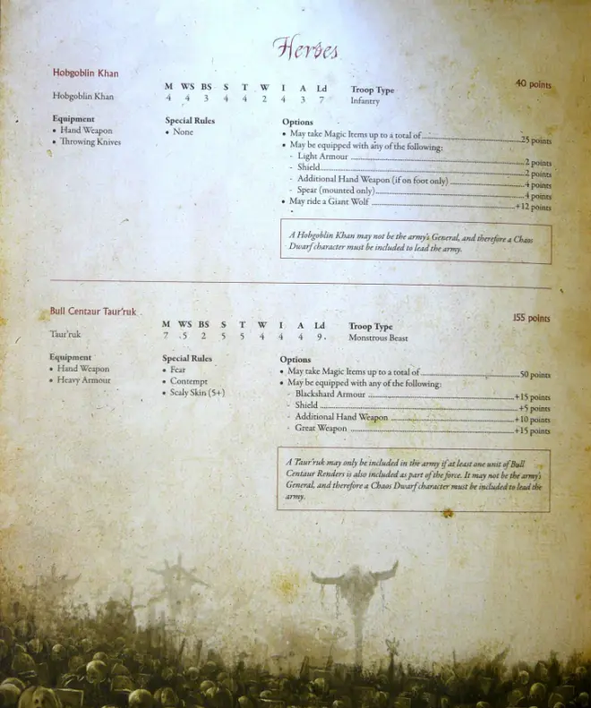 配合上怪物奥秘和魔法风暴规则中,混沌矮人能驯服赤焰金牛、灾厄巨牛、人面狮牛兽作为战兽,弥补混沌矮人最后的飞行单位短板。混沌矮人的兵种体系比矮人全面得多可以说是毋庸置疑。