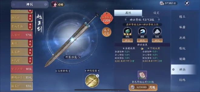 孔雀翎、紫刃流萤分别是17级和16级。新神兵鹦鹉血玉阴和越王剑分别是15级和13级。其他都是满级。相比较各大服务器的TOP3,在神兵这块是有差距的。