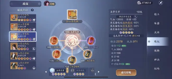 攻击部位全身都是道心+神人+辉宸+玄宙+上玄的顶配琅纹组合。防御部位都是道心+神人+菊台+梅林+上玄的组合。破拆属性性价比最高的地方必须得最大化投入。