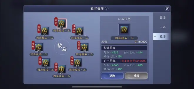 目前圆石、三角小石、方形棱石均满级20级,砭石毕业。