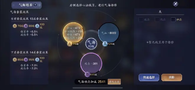 气海已经达到满层13层,拥有2541点功力加成。紫色气海141级满级。蓝色气海121级。金色气海71级,气海和同级别的账号有点差距,主要是差在金色心法七海。