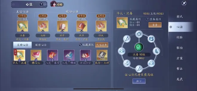心法组成:10级流毒+ 10级御长凝+10级炼武根骨+10级炼武力道+10级悲回风,五本金色心法已经全部点满,其次新的心法《一剑西来》点到8级。