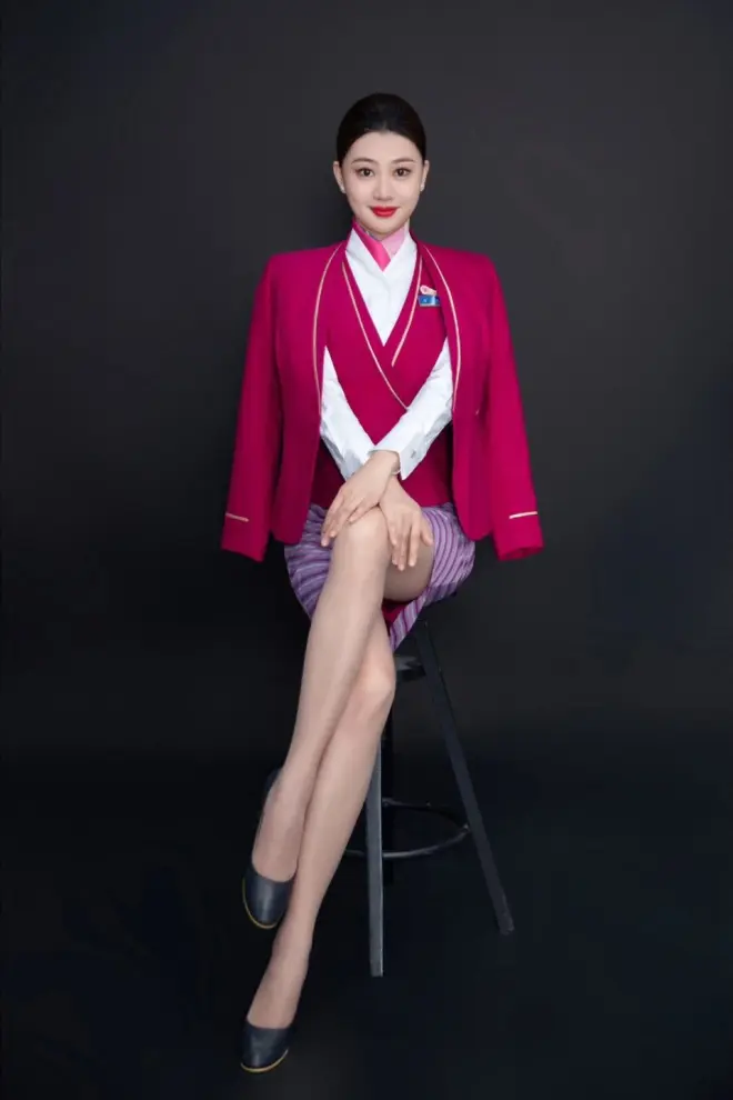靓丽的空姐上身穿着一套红色制服西装,内搭红色马甲和白色衬衣,优雅地端坐在高脚椅上,修长的双腿自然交叉在前放,脚上穿着的是一双黑色高跟鞋,整体装束靓丽大方、端庄优雅。