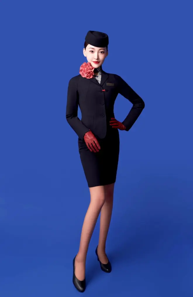 第二套是一袭黑色制服包臀裙,修长的双腿上点缀着咖啡色丝袜,脚蹬黑色高跟鞋。尤其是脖领出的红花装饰和枣红色皮质手套,凸显了美女空姐的魅力和气质,也彰显了空乘人员对着装的超高标准。