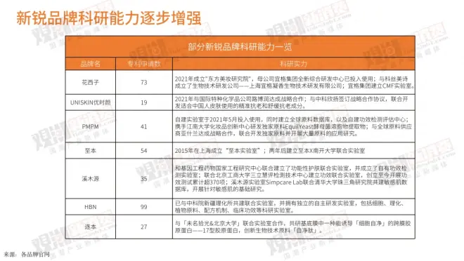 最后通过一个表格,给大家展示一下现在市面上新锐国货美妆品牌的研发构建和相关动态。