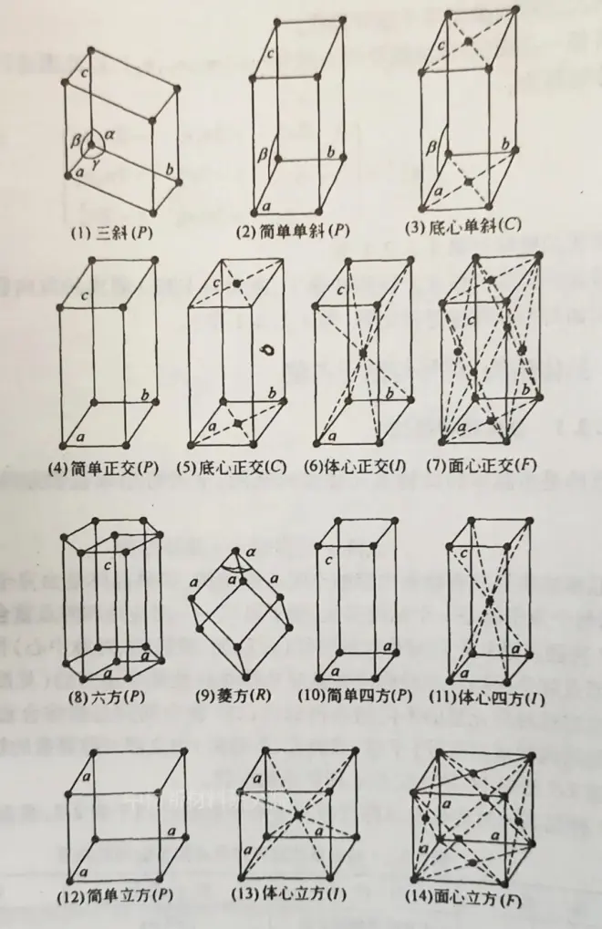 按照布拉菲选取单胞的原则,根据旋转对称的限制,可导出7种晶系。这7种晶系的初基单胞(称P单胞)所代表的点阵就属于7种布拉菲点阵。若把平移对称加入,即在7种单胞中的特殊位置加入阵点,如果加入新的阵点后不破坏原来点阵的对称性,而且又构成新的点阵,这就是一种新的布拉菲点阵。在初基单胞(P单胞)中加入了新的阵点,它就变成了复式初基单胞。经过面心化、体心化、底心化及特殊有心化可推出14种布拉菲点阵。