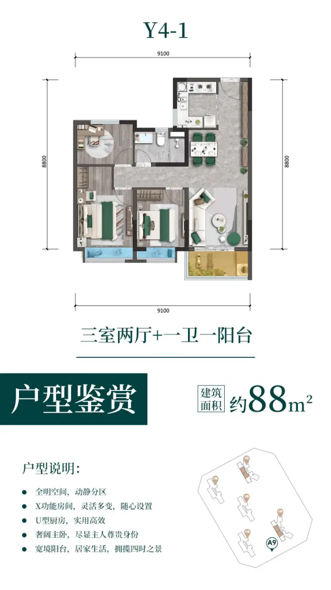 步行约10分钟可到达旁边的斗南湿地公园和滇池生态湿地公园,区域内植被覆盖率高,空气清新湿润 周边环境 周边湿地公园环绕,片区属新开发,城市界面不错。 三、户型分析 88㎡(中户):三室两厅一卫单阳台;