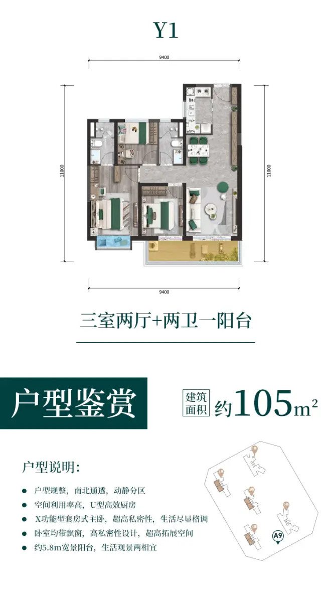 优点:U型厨房,餐、客一体,空间利用率高,客厅大阳台 缺点:蝶型设计,西北或西南向,采光不足。 105(中户)㎡:三室两厅两卫单阳台;