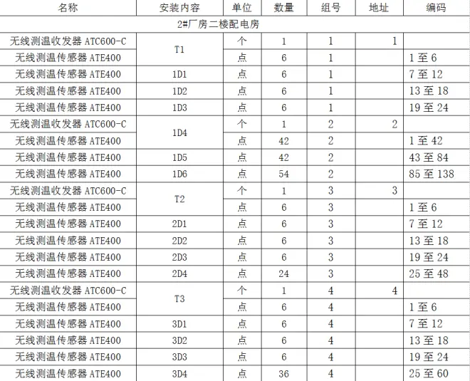 本项目使用无线无源测温传感器共计1200只,无线测温收发器共计18只。详细配置方案和安装情况如下表。
