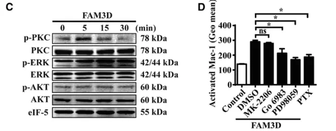 FAM3D在5分钟瞬间诱导PKC磷酸化,并在5分钟至30分钟持续诱导ERK1/2磷酸化。////感觉ERK不太显著,或许是图的问题 Go6983(PKC抑制剂)和PD98059(ERK1/2抑制剂),而不是MK-2206(AKT抑制剂),阻断了FAM3D诱导的Mac-1激活,表明PKC和ERK1/2参与Gi蛋白依赖的信号通路,介导FAM3D在中性粒细胞中的作用。