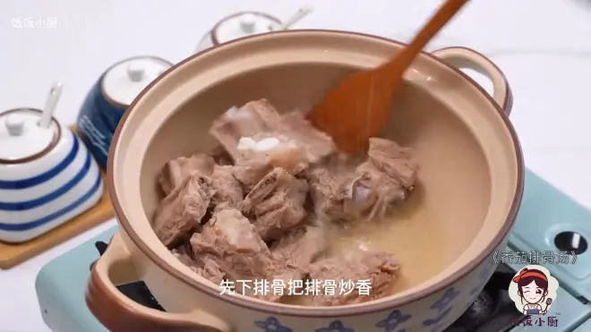 3锅内加油,清下排骨,排骨炒香,炒到表面有点焦焦的,然后下切好的番茄炒汁水,加开水和盐,先煲上半个小时