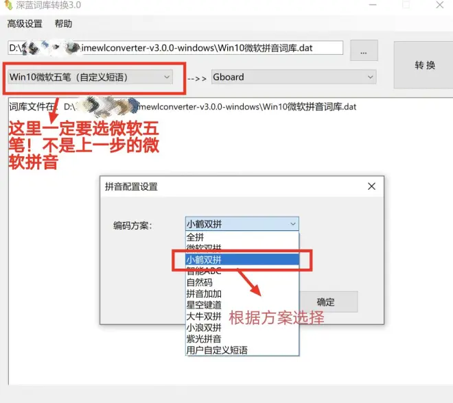 重要提醒:这里转换源使用的不是微软拼音格式,而是微软五笔格式
