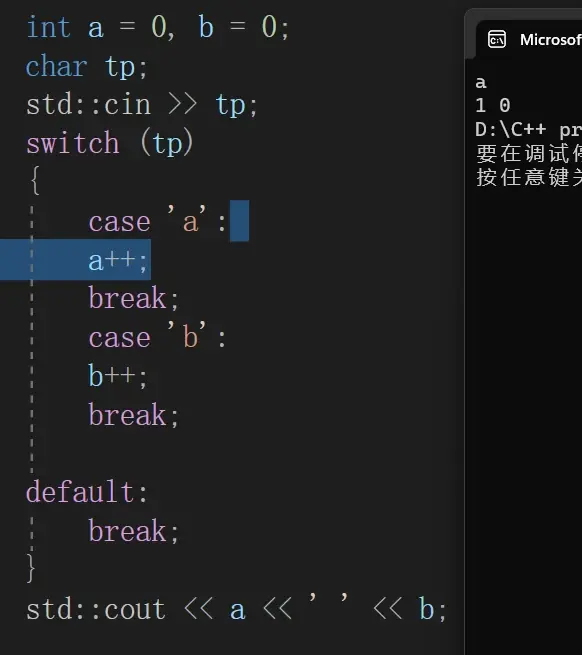 因为我们没有在case语句后加上break,所以他在匹配'a'之后将直接执行b++。