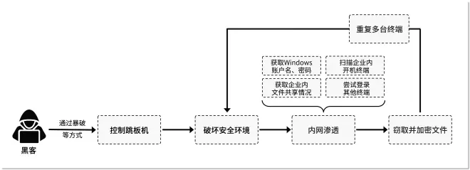 此外,若企业之前存在网络共享的情况,黑客还可以在入侵网络内任何一家企业后,以该企业为跳板,攻击其它的关联企业。一旦被攻击的其它企业未做防护,将面临各类安全风险。