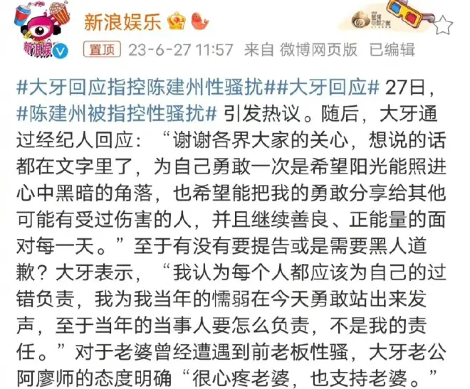 大牙指控陈建州性骚扰,陈建州否认反控其栽赃,职场霸凌有多无奈