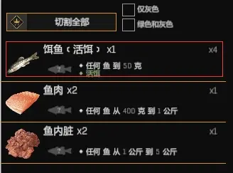 饵鱼(活饵)前期是有就要切的,因为能切的鱼卖商店肯定不如饵鱼贵,而且可以一边钓鱼一边切饵鱼(不需要任何工具或技能),鱼肉和鱼内脏只切灰色的鱼(不然会亏)。