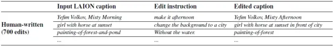首先,研究团队利用一个人工输入的数据集作为 fine-tuning GPT-3 的训练集,这个训练集的格式为输入描述(Input Caption),编辑指令(Edit Instruction)和编辑后描述(Editted Caption)