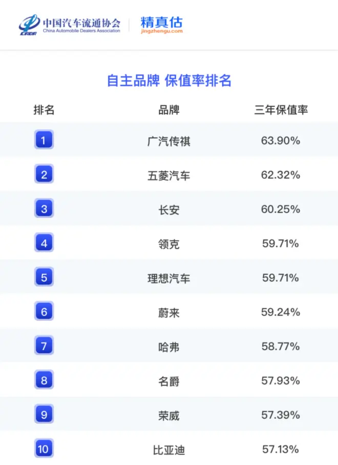 而且还有一个有意思的现象,广汽传祺以63.9%的三年保值率成为中国品牌的No.1。领克降幅最大,同比下滑8.24%,其次是五菱,同比下滑7.53%。