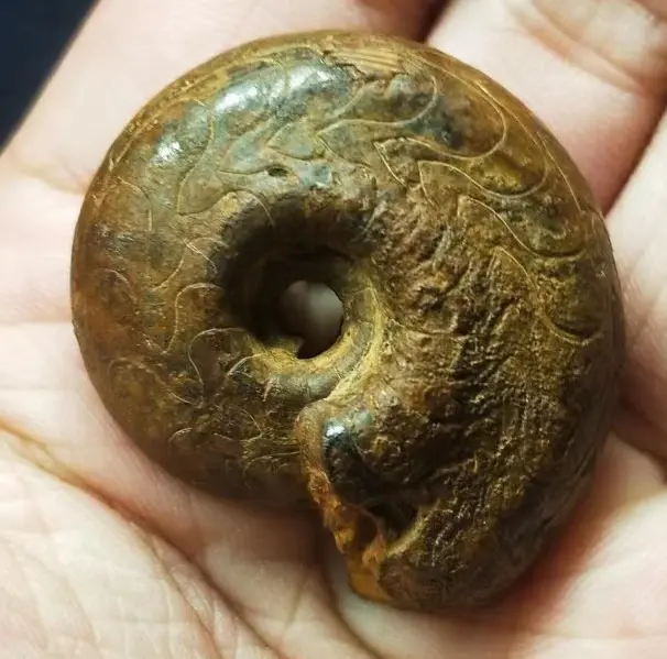 描述:壳内卷,呈厚饼状或扁球状。腹部穹圆,腹部及侧部外围饰有显著的纵旋纹,侧部内围光滑或饰有细皱纹及生长线。脐部窄小。缝合线为腹菊石式,共有八个叶及相同数目的鞍。除宽的腹叶两分支外,其余各叶都不分支。