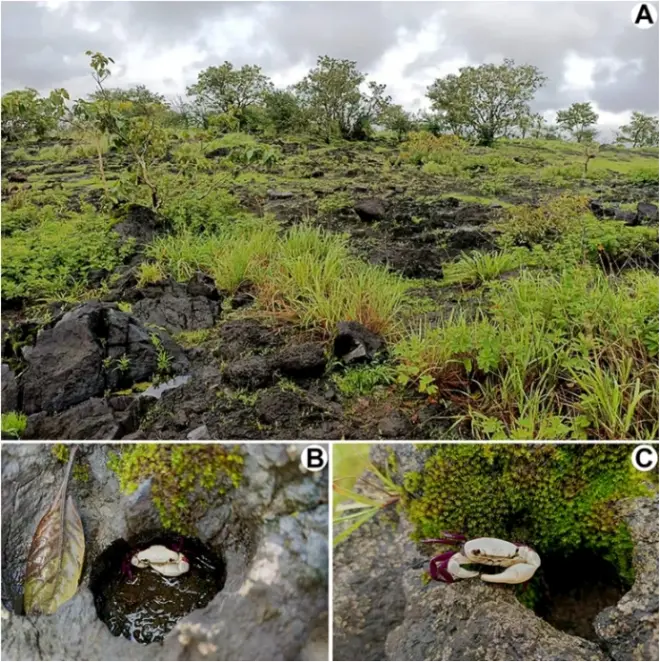 高止山蟹属Ghatiana Pati & Sharma, 2014和西高止山蟹属Sahyadriana Pati & Thackeray, 2018是印度最美丽的淡水蟹种类,这些璀璨如宝石一般的美丽小螃蟹生活于西高止山的渗水泥土和溪流岸边。本次描述的新种西高止山蟹具有最特殊的头胸甲形态是梯形的,前宽后窄,而且前后长度很短(甲长和甲宽的比值是1/2,为本属最宽)。其栖息地也很特别,在海拔六百多米的潮湿岩石孔洞中,这个环境看起来地表径流相当缺乏,相应的这种螃蟹的第一触角窝也高度退化,表现为细小的裂缝状,论文中描述这些螃蟹会在夏季风带来的降水中活动,阴天更活跃,季风消失后,它们会钻进岩石上的孔洞之中。