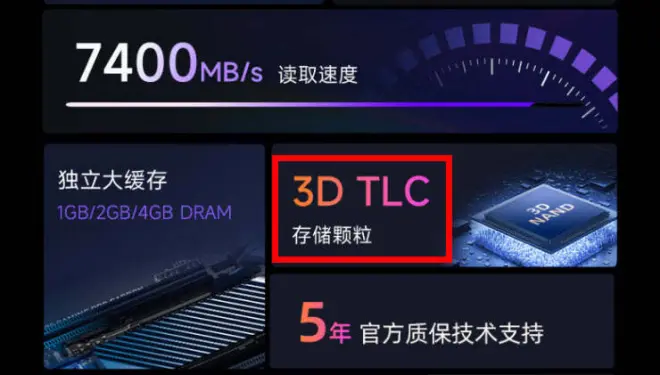 以某国者 (aigo) P7000D为例,这款产品采用了英韧5236主控,颗粒方面就有意思了。其中1T和2T版本,采用了长存颗粒,4T版本则采用了美光颗粒。但厂商在宣传页面中却没有明确的告知,只是说采用了3D TLC颗粒。