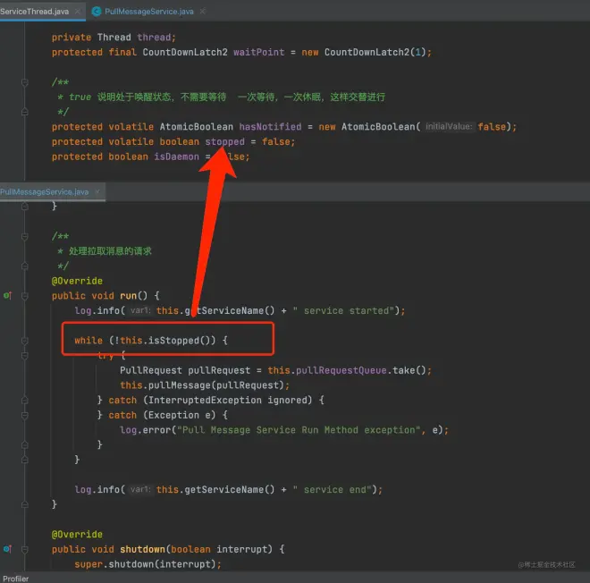 当消费者客户端关闭的时候,就会将stopped状态设置为true,告诉拉取消息的线程需要停止了。但是由于并发编程中存在可见性的问题,所以虽然客户端关闭线程将stopped状态设置为true,但是拉取消息的线程可能看不见,不能及时感知到数据的修改,还是认为stopped状态设置为false,那么就还会运行下去。