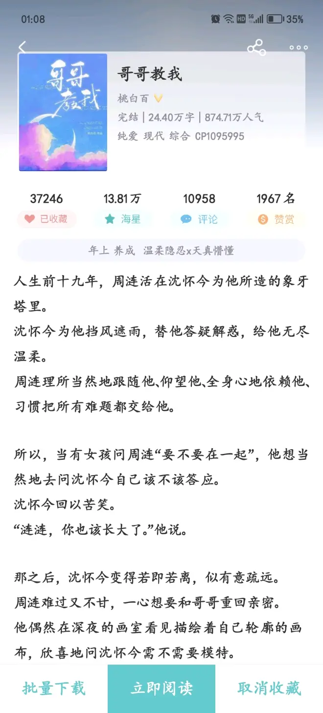 如作者所言,这篇文的重点在于“教”这个字。攻教受理清亲情与爱情,或者说带他探寻爱情的边界到底在哪。 受前期表现出来的心悸很有意思。那或是害怕,或是心动,亦二者皆有。爱从不是什么可以用逻辑理性直接阐述出的东西,它不可明说,需要用心去体会。人们很难去定义爱,但我想文中这个案例就是一种爱,是亲情更是爱情。 文偏感情流。感情线循序渐进,主人公也在其中得到了成长:受逐渐熟悉爱情真相并接纳它;攻也最终得到了他想要的爱情。完美的he。 甜度不高(指纯糖)。这篇文家长里短与现实生活遭遇的苦恼不算少,也正是一地鸡毛蒜皮让这篇文贴近生活但又不完全属于生活,他们的爱意使生活挣脱平淡,达到了生活的理想状态。没那么笨的受与没那么聪明的攻罢了。唯一缺点就是不那么戳我XP吧(doge