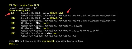 在shell中输入上一步中的U盘的位置+冒号,比如我这里是fs0就输入fs0:回车确定。命令行显示fs0:\>为当前目标位置。