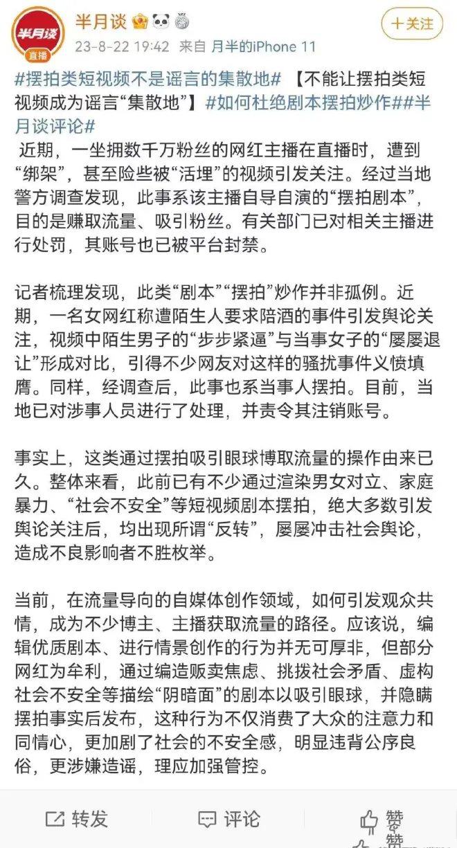 半月谈点评二驴事件:通过编造贩卖焦虑、挑拨社会矛盾、虚构社会不安全等描绘“阴暗面”的剧本以吸引眼球。网红为牟利行为不仅消费了大众的注意力和同情心,更加剧了社会的不安全感,明显违背公序良俗,更涉嫌造谣,理应加强管控。