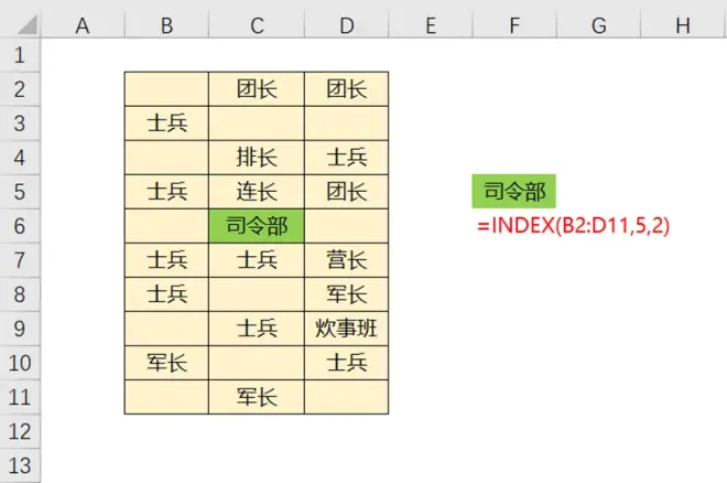 划定一个区域(B2:D11),给出坐标(5,2),Index顺利带回目标单元格的值(司令部)。