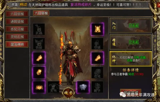 在黑暗光年游戏中魂祭系统是在开服65天后开放的,魂祭系统就是利用多余的六耳猕猴、通臂猿猴、赤尻马猴装备来强化已穿戴的装备,可以增加多项属性,有攻击、切割、生命值、防御以及装备基础属性百分比,天书和神鼎部位不可魂祭。