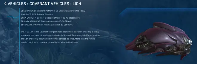 Kmiro'sish-pattern world patroller / 克米罗'西什型巡世者被UNSC命名为Deployment Platform T-56 Ground Support / Ultra Heavy / 56式地面支援/超重型部署平台,俗称Lich / 巫妖号,由阿乔姆军械制造。按照大多数星盟载具的命名方案,它以超自然生物命名。