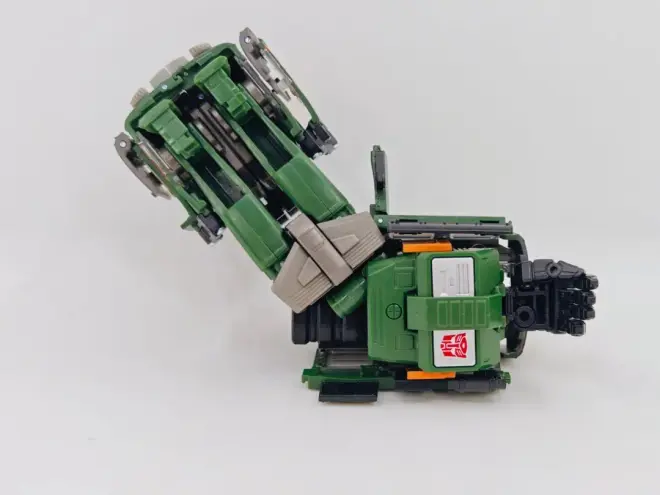 如果不考虑这莫名其妙的肩部设计的话,玩具其他部分可动性还算不错,哪怕小腿太过庞大,但依然能做出比较自然的下蹲动作。