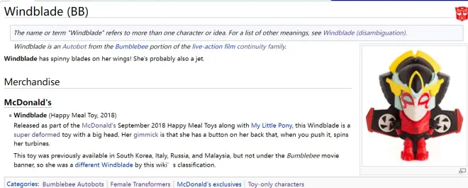 这个玩具以前在韩国、意大利、俄罗斯和马来西亚都有,但没有出现在《大黄蜂Bumblebee》电影的标题下,所以根据这个维基的分类,她是一个不同于风刃Windblade(G1)的角色。