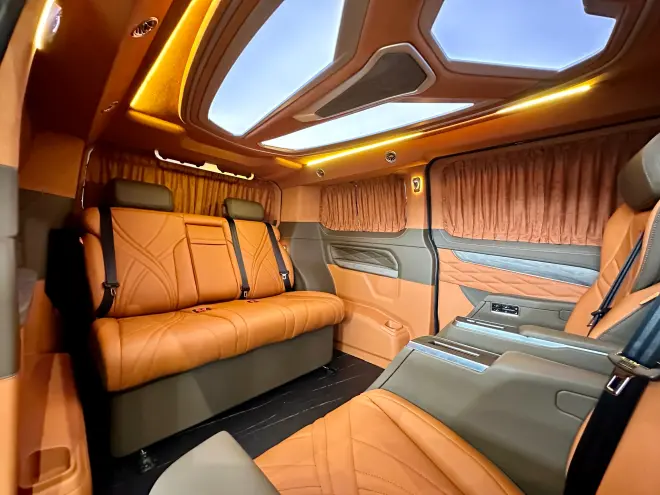 第三排是一键2可以放平的沙发床,可以180度的平躺,当然如果想睡觉,可以和第二排座椅进行拼接,瞬间组成2米的大床,周边都带有窗帘,可以很好的保护隐私性,夏季避免阳光的直接照射也很重要。就这样的一款MPV商务车,集娱乐,休闲,商务,接待于一体,真正的一款能自己开,能商用的车型,家庭事业的好搭档。