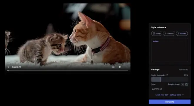 Gen-1模型的操作方法非常简单,在屏幕中间点击上传一段视频。
