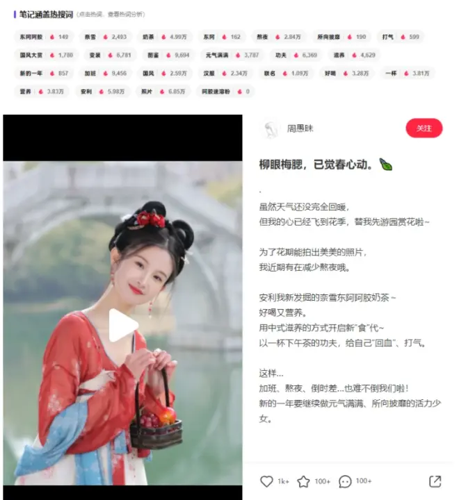 此次联名,在宣发上,也没有忘记国潮特色。笔记《柳眼梅腮,已觉春心动》,内容布局奶茶、熬夜、国风、汉服等热词,博主身着汉服,置身河畔,营造出浓浓的氛围感,一下换下看客心中的国风记忆。树立产品形象,加深品牌印象。
