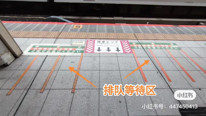 图五:站台地面上贴着对应线路的等候区,这时候线路颜色就能发挥作用了,一定要站在跟你乘坐线路颜色相同的格子内等待,有些站台可能会有多个列车停靠,也会有不同颜色的等候区,找错的等候区可能会上错列车,这个一定要注意。