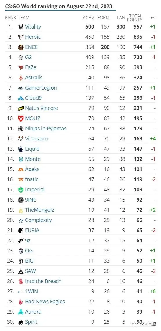 2023年8月22日CSGO战队排名:刚斩获石油杯的Vitality成功登上世界第一宝座!Heroic退居次席,石油杯亚军ENCE已升至第三。VP凭借石油杯上的表现上升4名到第12,TheMongolz已经来到第19。
