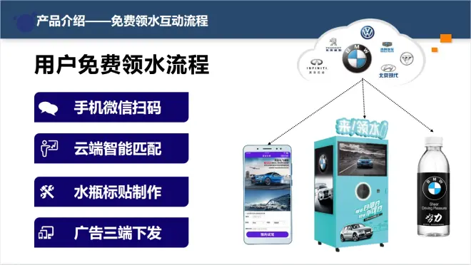 茄豆智能领水机是用免费领水来吸引大众,从而达到给企业宣传的效果。那为什么茄豆能做到免费领水呢?因为你领到的每瓶水的瓶身上都有广告,企业为了宣传帮你支付了水钱。简单来说就是广告商请你喝的水。