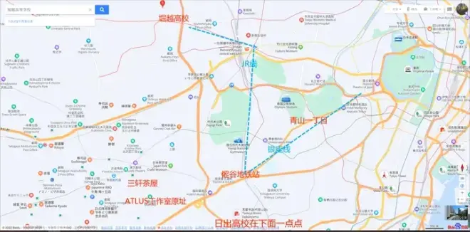 首先最关心的现实地点。 堀越高校位于中野区中央二丁目,从三轩茶屋家去堀越高校实际上还要近一点,步行就可以到达。 两条蓝色的虚线分别是银座线和JR线,从涩谷去堀越所乘坐的JR线,在游戏里改成罗马音相似的JL线。 地图上看着远,实际上出了新宿地铁站到堀越和出了涩谷站回家的距离是一样的。地铁也就几站路,想在上学路上看完一本书估计要看一个学期。 游戏中设定的秀尽所在地苍山一丁目,原型是银座线上的青山一丁目。这里是使馆区和东宫御所,所以附近没有任何大中小学,特意选择这里也是为了避免产生太直接的现实关联。