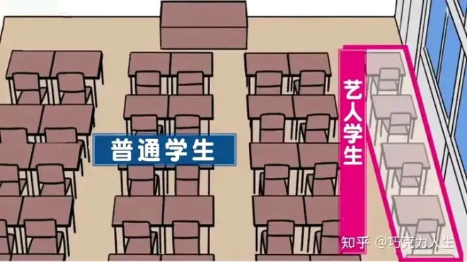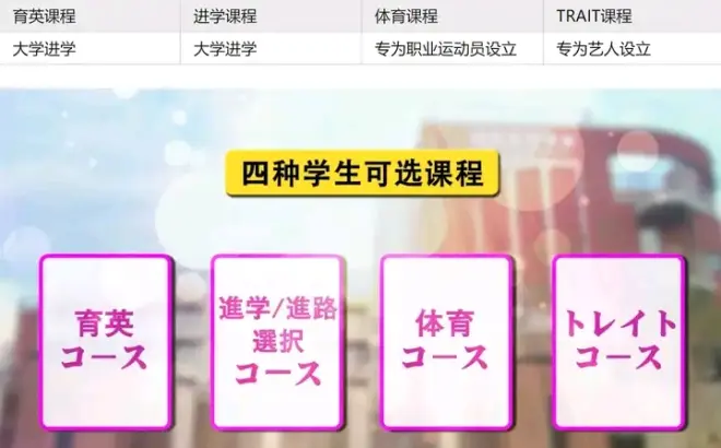 除了高昂的学费和严格的入学门槛这些名校标配外,堀越高校最大的特点就是围绕着艺术和体育特长学生培养而设置的一系列特殊教育制度。 堀越高校是日本少数采用【单位制课程】的综合类高中,一共设立了四种不同的课程。对于平日工作繁忙的演员、歌手和职业运动员学生而言,特长科课程的最大优势在于它的【时间池制度】。 就算在平时因为演出、训练和比赛原因导致出席率不够,也可以用清晨、周末或是寒暑假等其他时间来补回落下的课程,学生们也可以放心大胆的在上课期间去从事各种艺术和体育活动。 当然一般人想进入特长课程班可谓是非常困难。因为每年只有180人的名额,40~50人一个班,入学方式与普通的考试凭分数入学也不同,还需要通过推荐入试的书类审查和面试两个额外环节。换句话说,进入这所高中的特长课程,考验的不仅仅是个人的学习能力和艺术特长,还有背后所属的演艺事务所的后台。杰尼斯事务所、东宝艺能、索尼音乐等等都是与堀越学园交往密切的事务所。 龙司、杏、真分别象征着堀越的三类特殊课程:体育、艺术、升学。