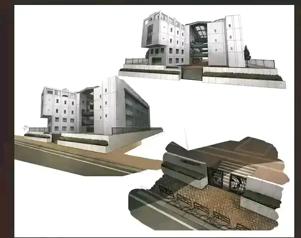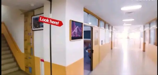 带有校徽的教学楼侧面凸出部分,还原的是正对侧门带有校名的外悬楼体,天井在看台后面。