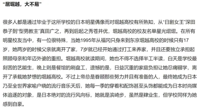 而如果把秀尽和洸星分开,洸星高校的原型还有另一种可能——日出高校。 堀越高校历来被称作文娱圈半壁江山,而另一半江山就是同在涩谷附近的日出高校,现更名目黑日本大学高校。 日出高校的毕业生更是重量级:山口百惠、新垣结衣、铃木爱理。 日出高校比堀越离三轩茶屋还近,如果洸星真在这里,确实适合阿蓝住下,每天波特还没下地铁阿蓝就已经进教室了。