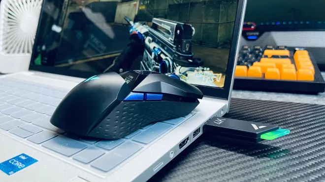 同时,这款鼠标还支持升级4K回报率,为此我一并入手了雷柏的V2M无线接收器,通过连接电脑后在驱动软件中根据步骤进行简单的设置:把驱动升级到最新版本,将鼠标和电脑通过有线连接,插上V2M无线接收器,拔掉鼠标数据线,将鼠标关机重启,同时按住左、中、右三个键就可以匹配成功了,这样,我们就可以实现4KHz/2KHz/1Khz三档回报率调节,不仅能使其在高速移动和精确瞄准方面有着出色的表现,也满足了我不同的使用场景。
