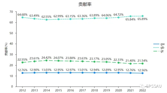 上图直观的展示了组内基尼系数Gw、组间基尼系数Gb和超变密度基尼系数Gt对总体基尼系数的贡献率,可以看出,近11年间,中国人均收入不平衡基本上均由组间基尼系数Gb主导,即区域与区域之间的收不平衡起着主导作用。