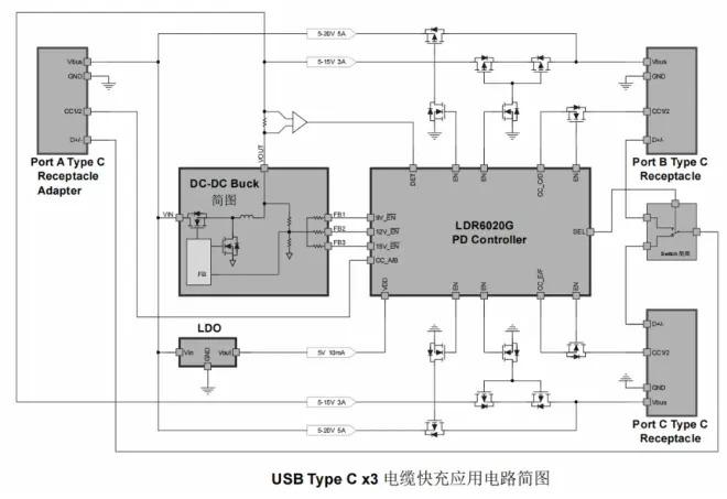 应用简图中可以看出LDR6020的CC通道分为AB,CD,EF,一共三组6条通道,其中AB连接适配器端,CD连接Type-C充电1,EF连接Type-C充电2,实现了三口设备CC同时通讯(最高可以实现六口同时通讯),未来乐得瑞科技还将加入三口盲插功能,不需要区分三口哪个是输入哪个输出,任选一口连接适配器,另外两口自动转为输出口。